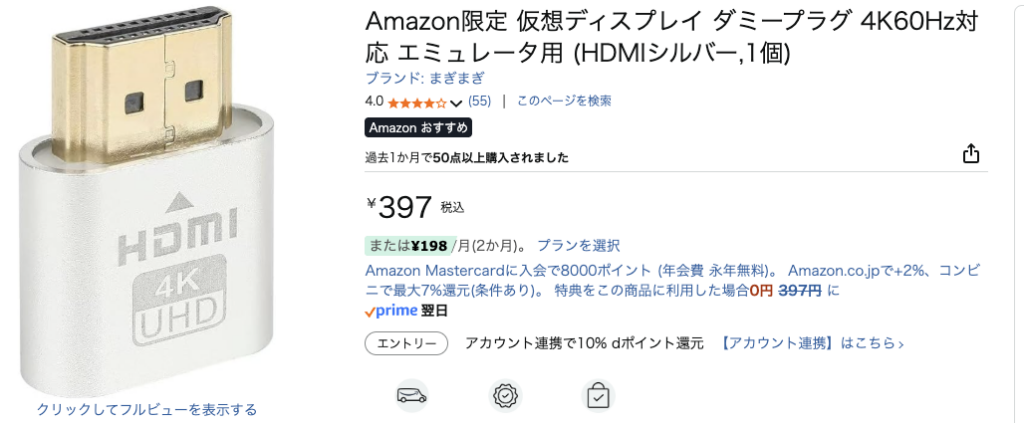 2560×1440など2Kから4Kの間の解像度に対応したHDMIダミープラグもありますが、軒並み4000円以上する上に、4K解像度ではリフレッシュレートが20Hz以下になったりするなど使いにくい部分があったりします。また、これらは商品説明に無いので買ってみないとわからないという問題もあります。