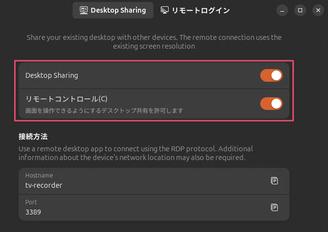 Ubuntuをヘッドレスで運用する場合、SSHで接続するか、下記設定をONにしてWindows Remote Desktopで接続して運用することになると思います。