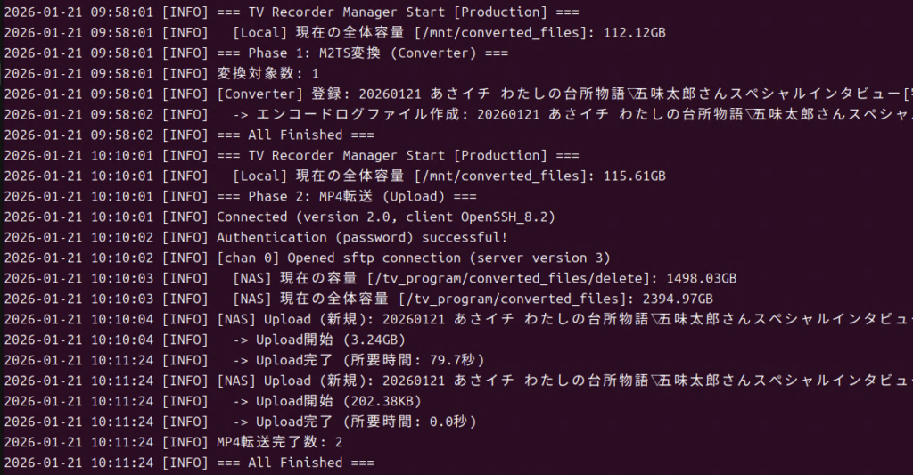 1-59/3 * * * * /usr/bin/python3 /home/tv-recorder/Scripts/TvRecorder.pyN100など非力なCPUでTVサーバーを構築している場合、録画中の変換処理でDropが発生することを避けるため、実行時間を深夜から未明にかけてなど録画番組のない時間帯に限定してスクリプトを起動するように設定すればよいです。